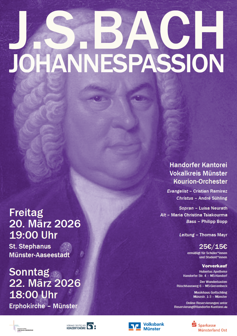 Nach der Bach'schen Matthäuspassion im Jahr 2024 freuen wir uns nun auf dessen Johannespassion, welche wir wiederum in Kooperation mit dem Vokalkreis Münster und dem Kourion-Orchester aufführen.
